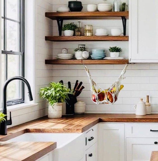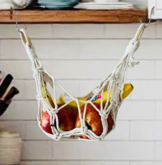 Bolsa colgante para frutas o verduras realizada a Macramé en hilo de algodón.