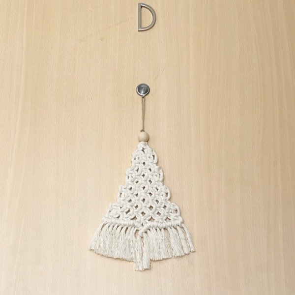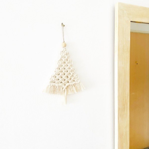 Arbolito de Navidad estilo tapiz realizado con hilo de algodón con detalle de madera y yute para colgar.