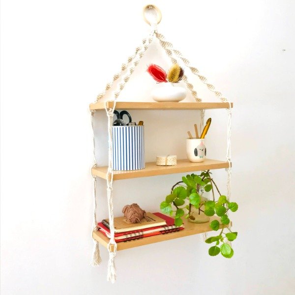Repisa de 3 estantes en Madera sujeta con Hilo de algodón a Macramé.